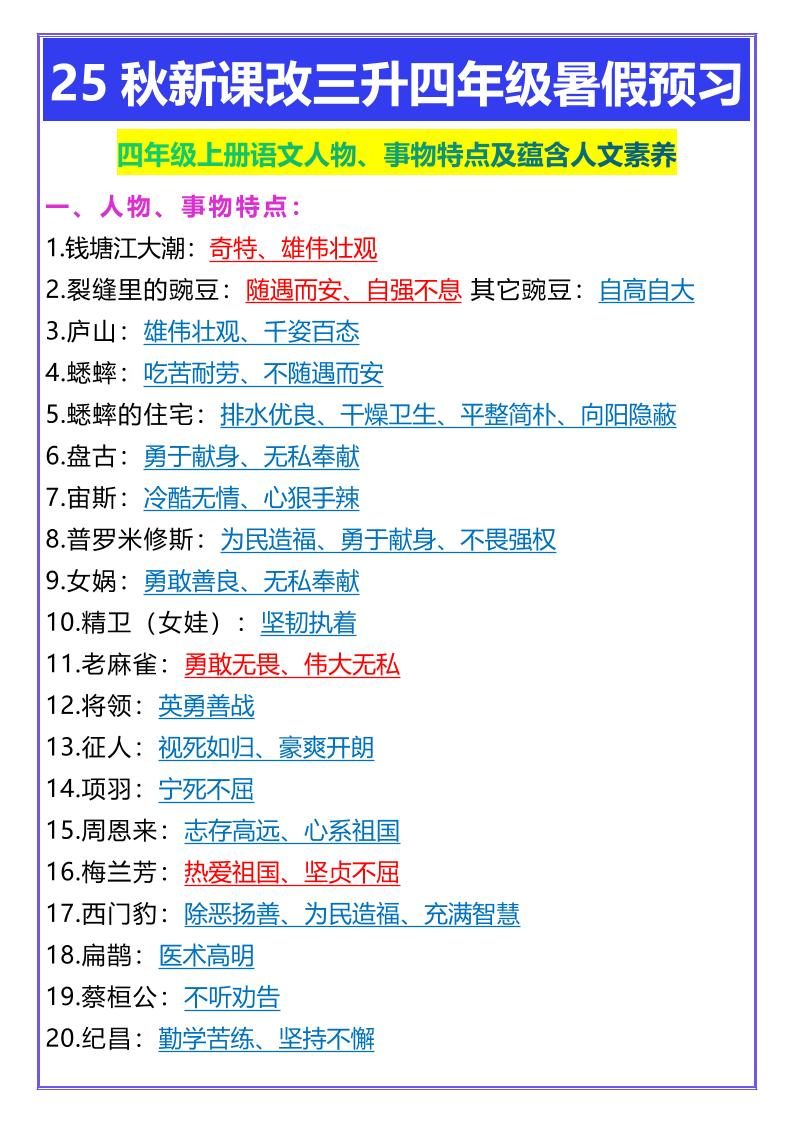 当前位置:首页学科年级四年级【2025秋新版】四年级上册语文人物、事物特点及蕴含人文素养