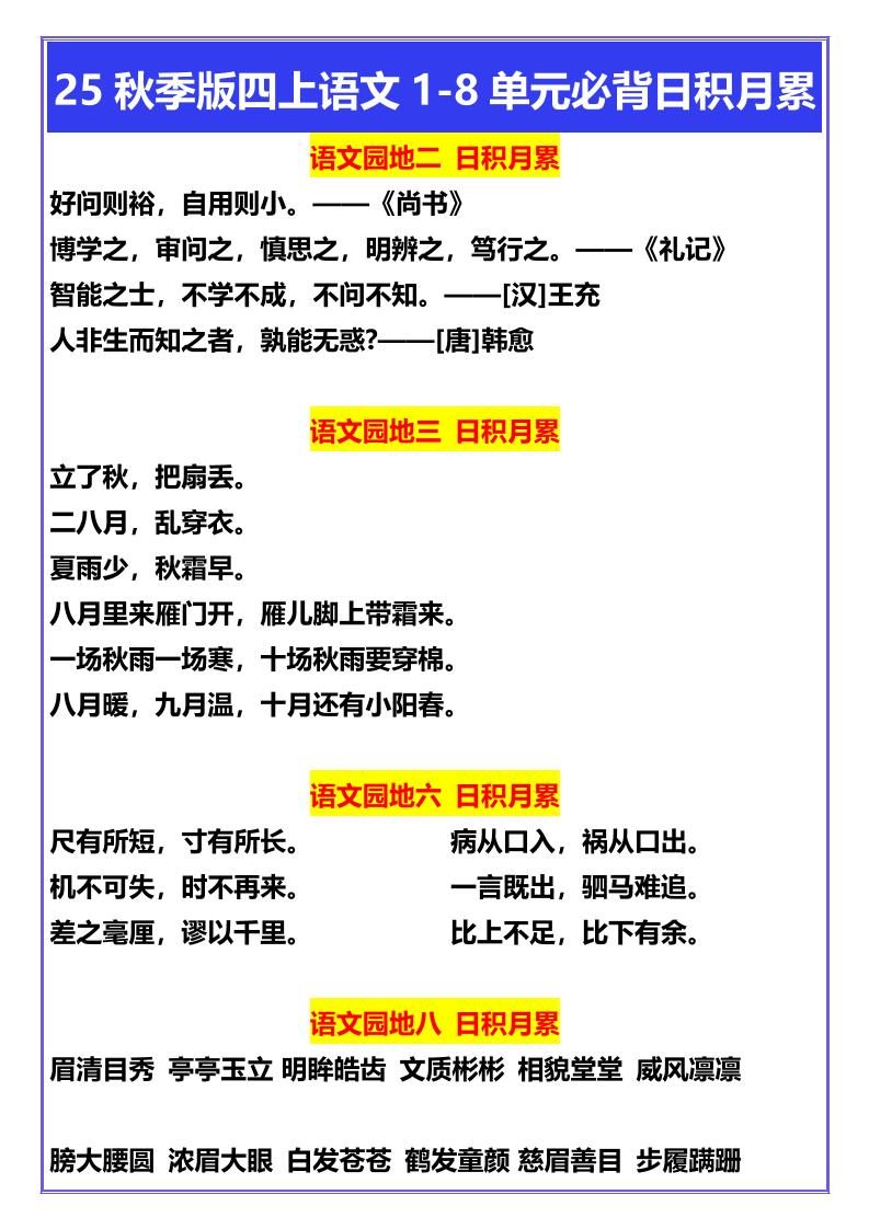 【2025秋新版】四年级上册语文1-8单元必背日积月累