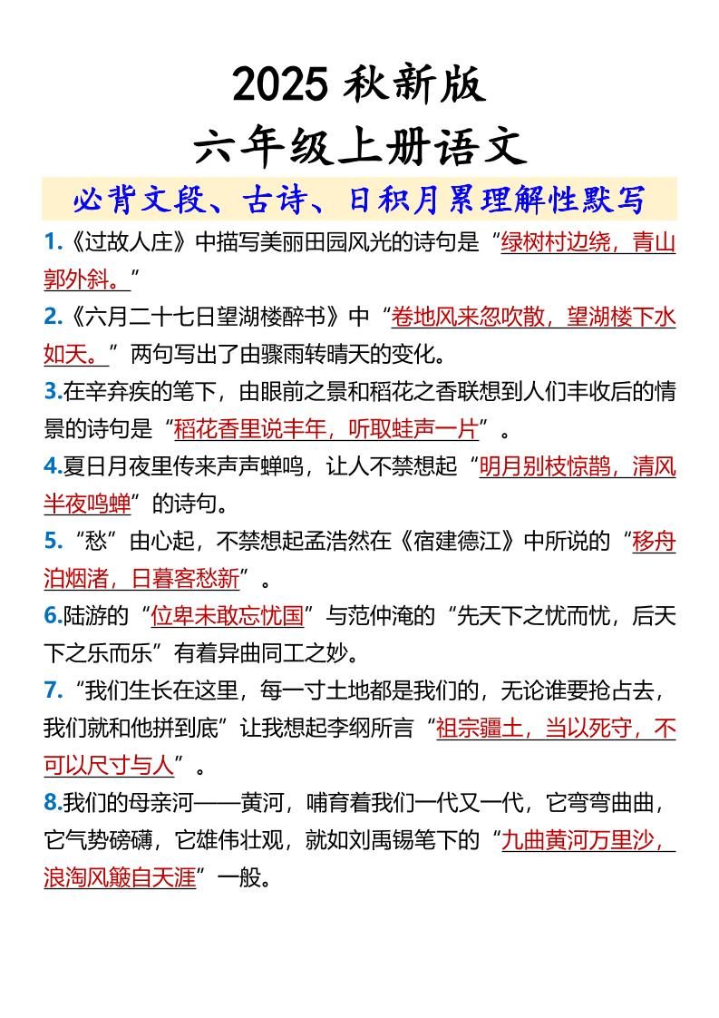 【2025秋新版】【六年级上册语文】必背文段、古诗、日积月累理解性默写