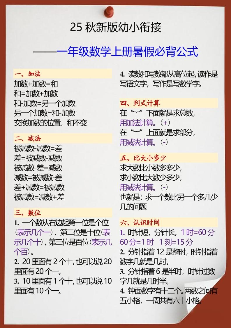 【2025秋新版】幼小衔接一年级数学上册暑假必背公式