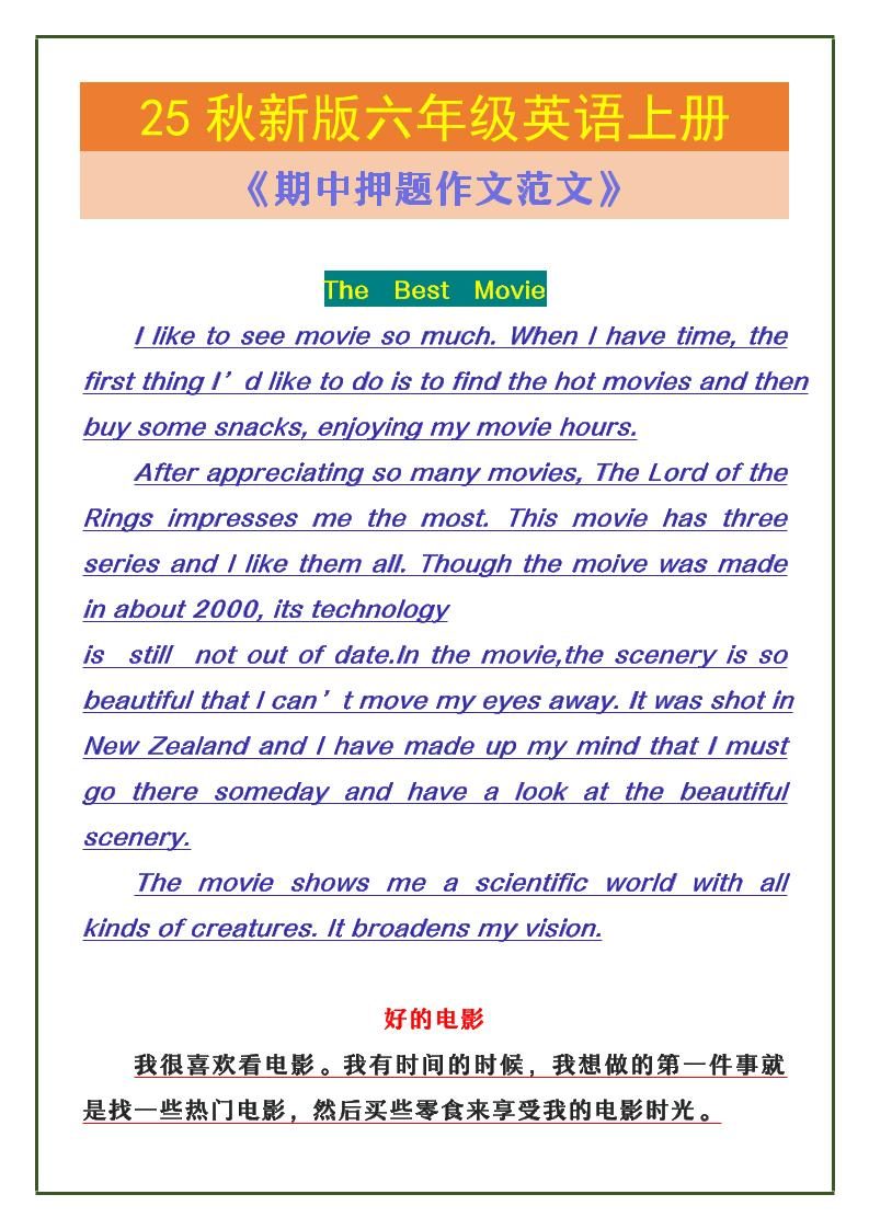 【2025秋新版】六年级英语上册《期中押题作文范文》
