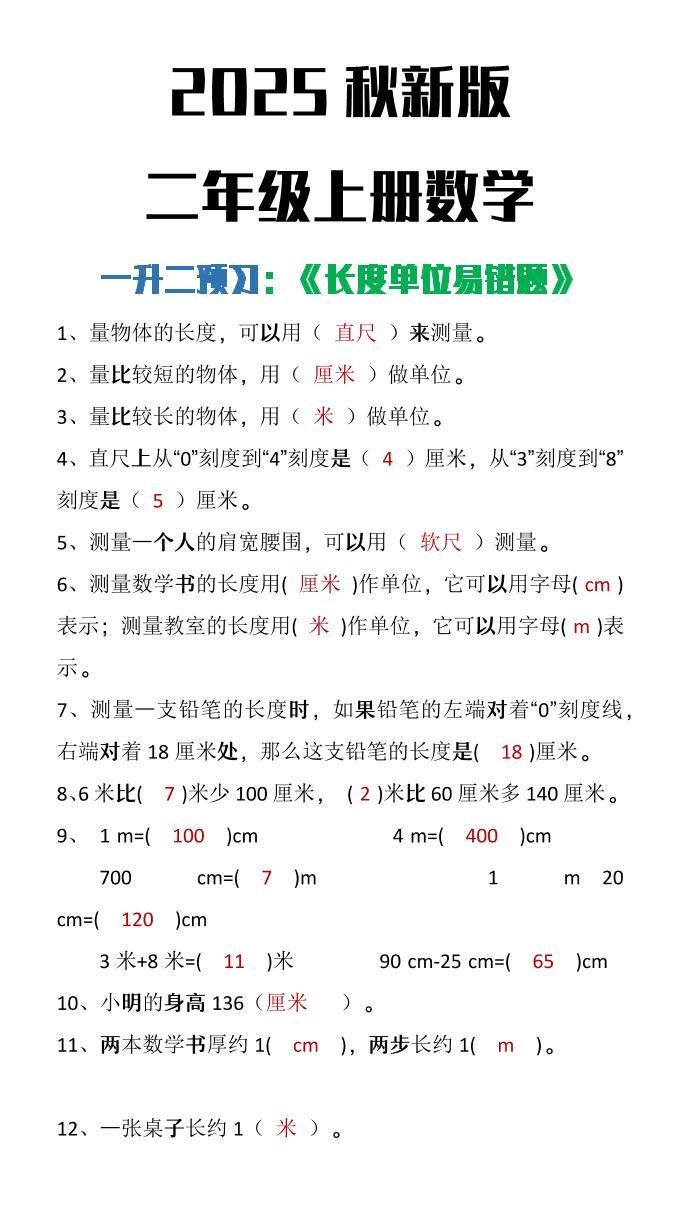 当前位置:首页学科年级二年级【2025秋新版】二年级上册数学《长度单位易错题》