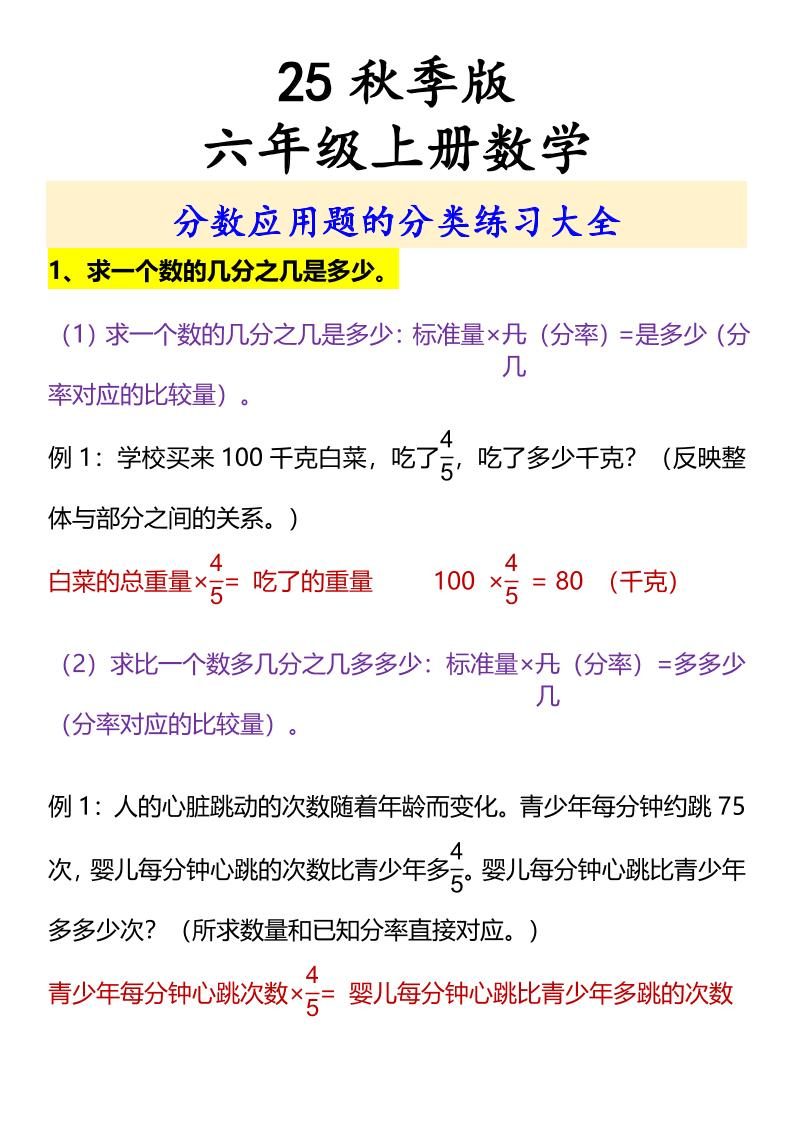 【2025秋新版】六年级上册数学分数应用题的分类练习大全