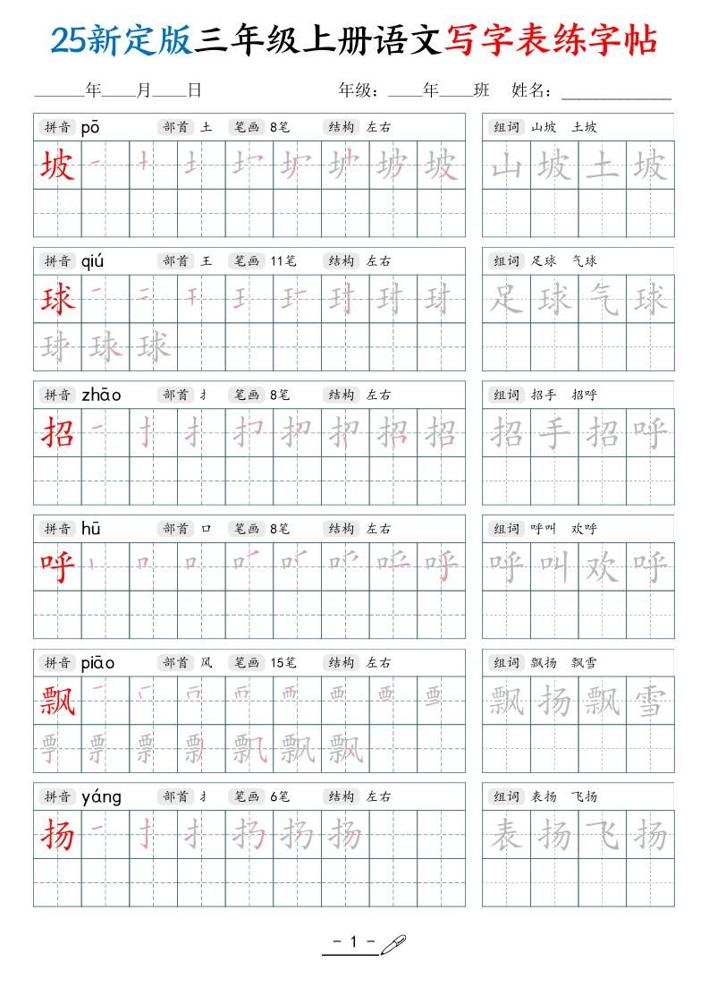 25新定版三上语文写字表生字练字帖(拼音描红笔顺组词250字)25页