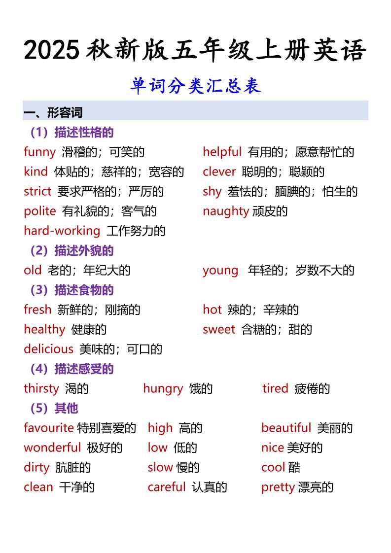 当前位置:首页学科年级五年级【2025秋新版】五年级上册英语单词分类汇总表