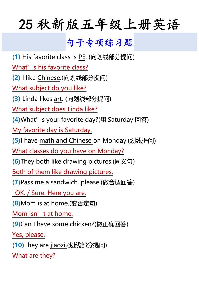 当前位置:首页学科年级五年级【2025秋新版】五年级上册英语句子专项练习题