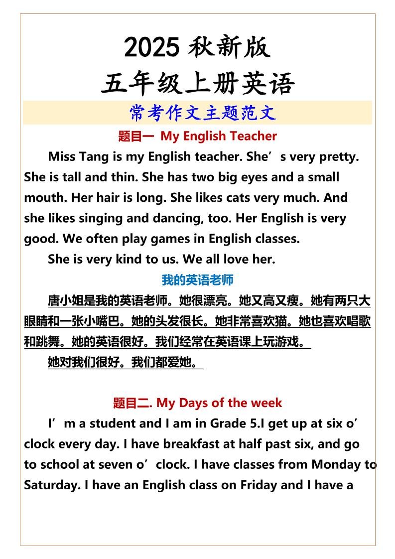 【2025秋新版】五年级上册英语常考作文主题范文