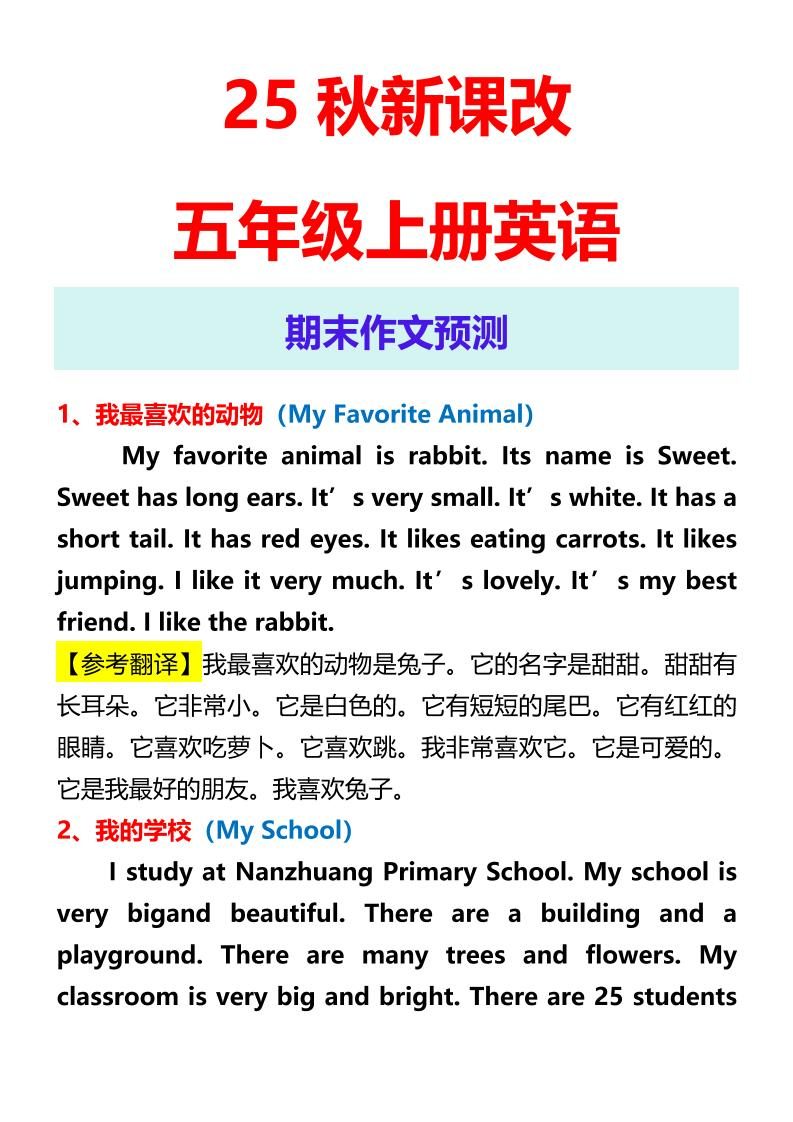 当前位置:首页学科年级五年级【2025秋新版】五年级上册英语期末作文预测