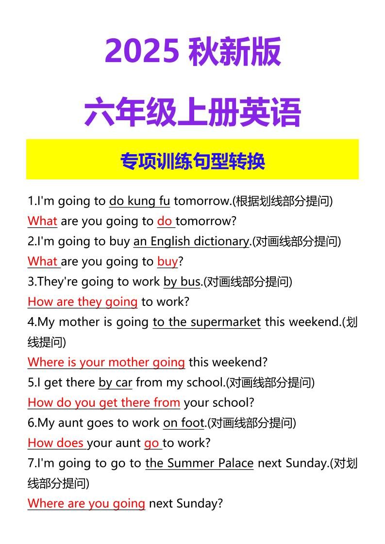 【2025秋新版】六年级上册英语专项训练句型转换