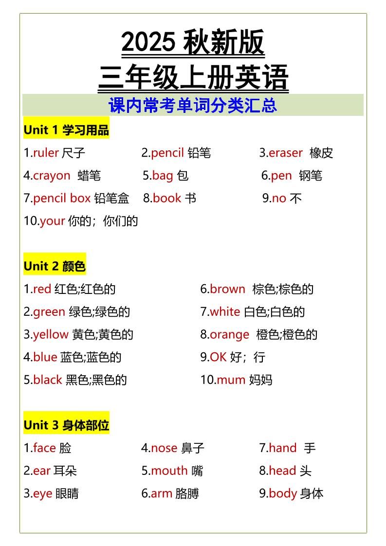 当前位置:首页学科年级三年级【2025秋新版】三年级上册英语课内常考单词分类汇总