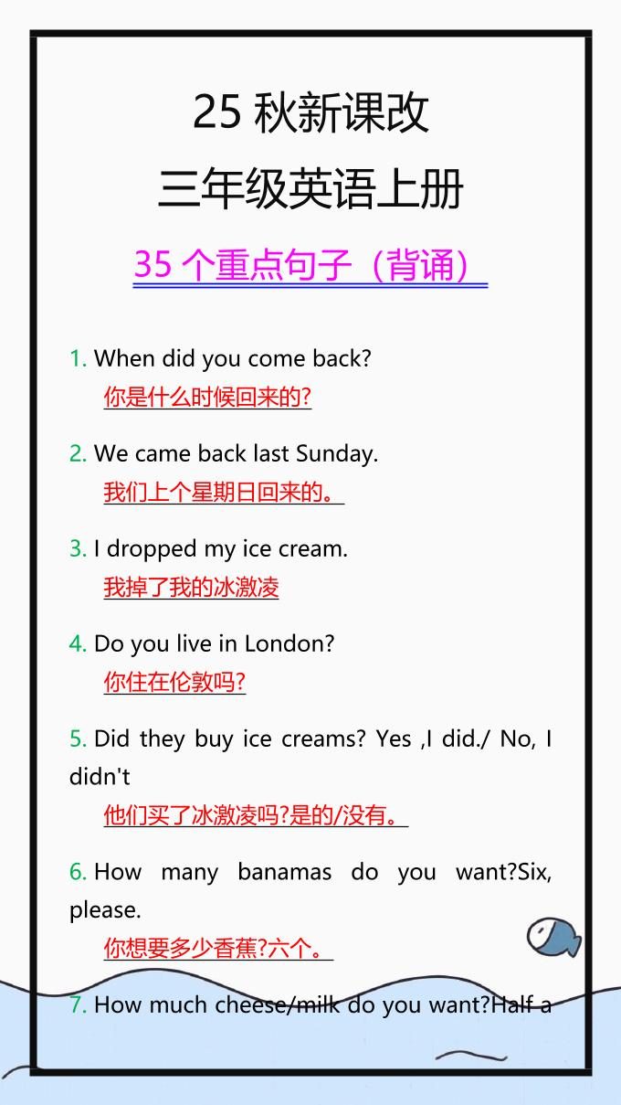 【2025秋新版】三年级英语上册35个重点句子,收藏背一背!