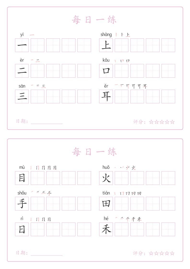 25秋一年级上册语文写字表每日一练字帖(5字版)9页