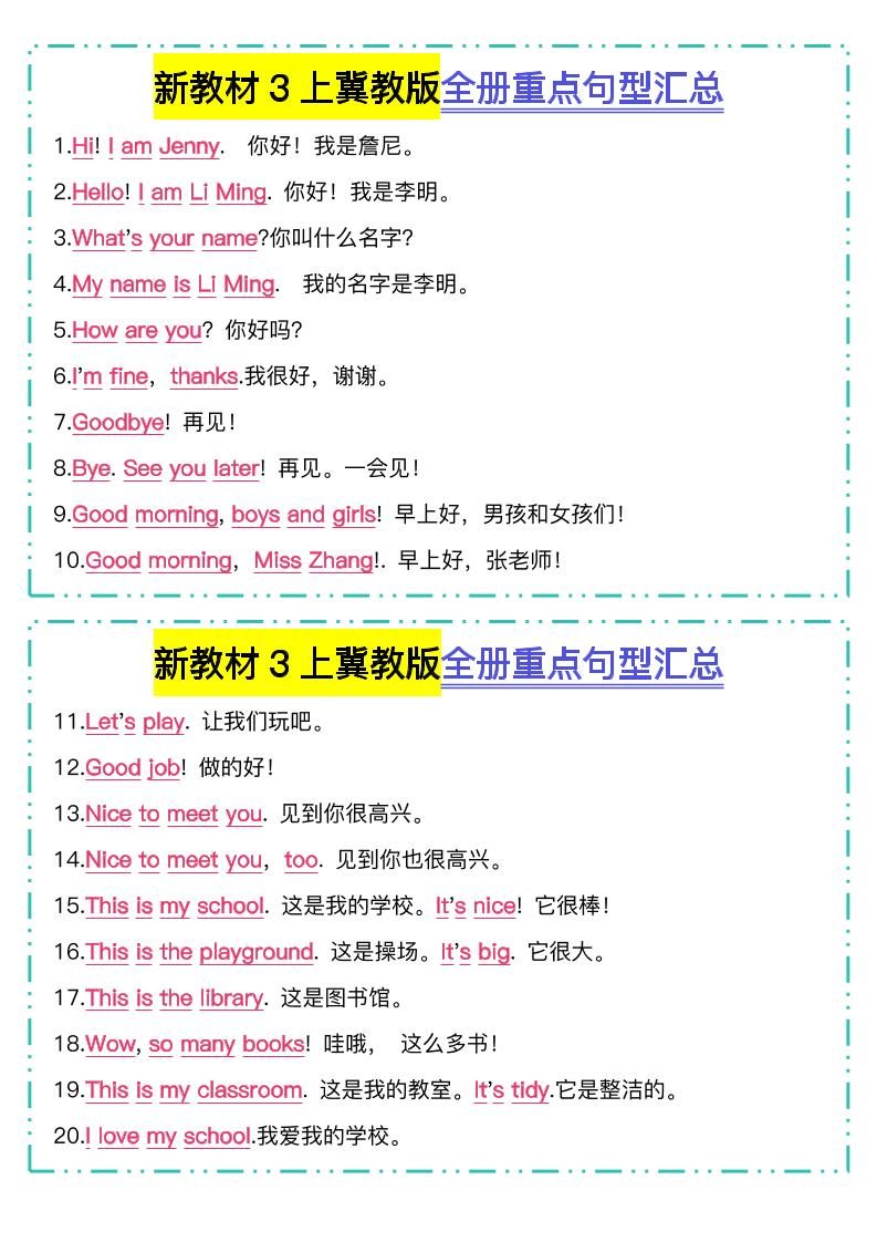 新教材三上英语冀教版全册重点句型汇总