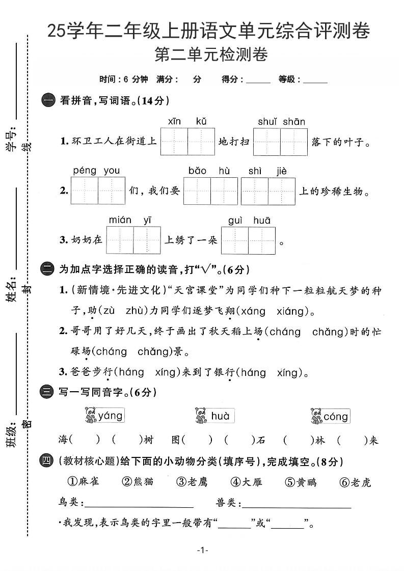 当前位置:首页学科年级二年级25学年二上语文第二单元综合评测卷-环卫工人(含答案5页)