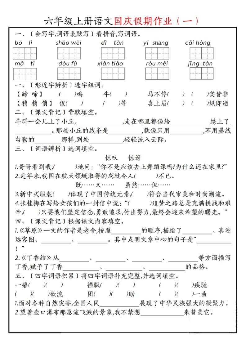 六上语文国庆假期作业每日一练7页