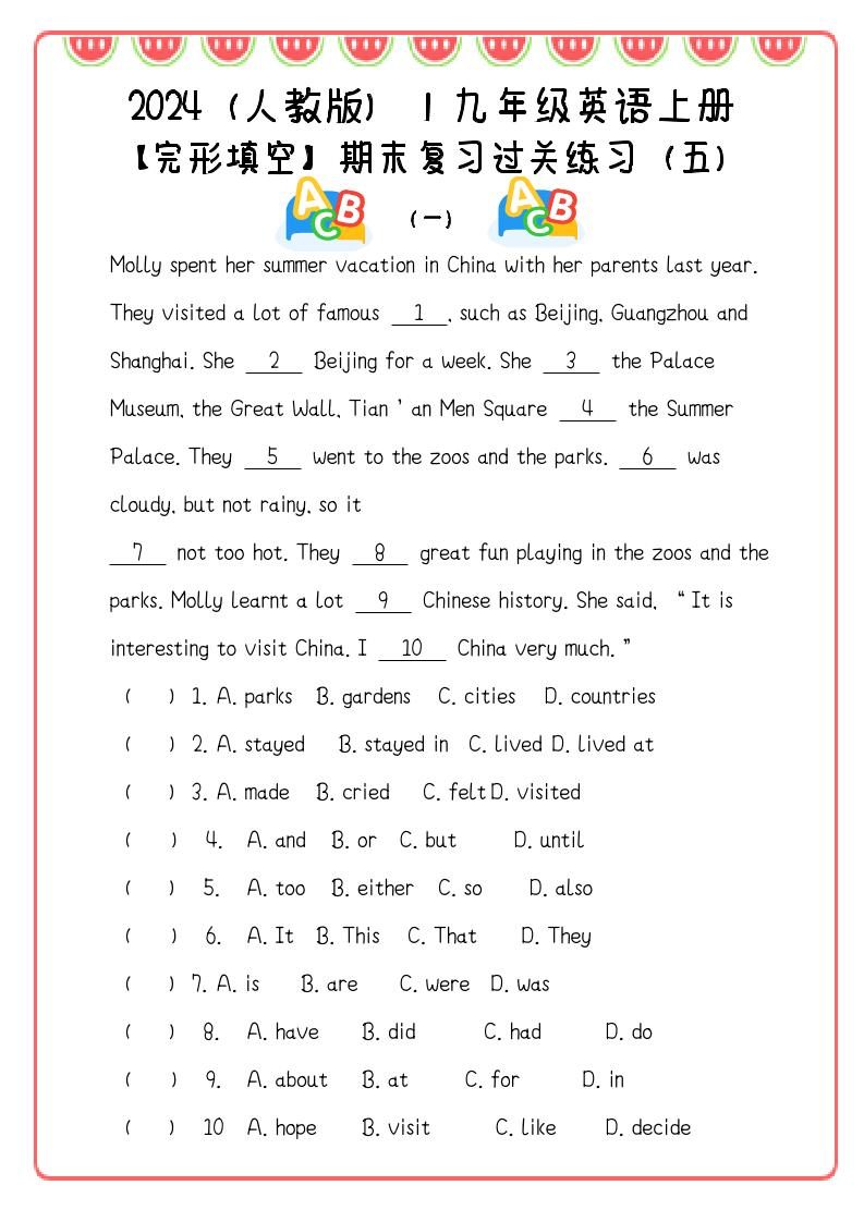 【2025秋新版】九年级英语上册:完形填空期末复习过关练习(5篇)