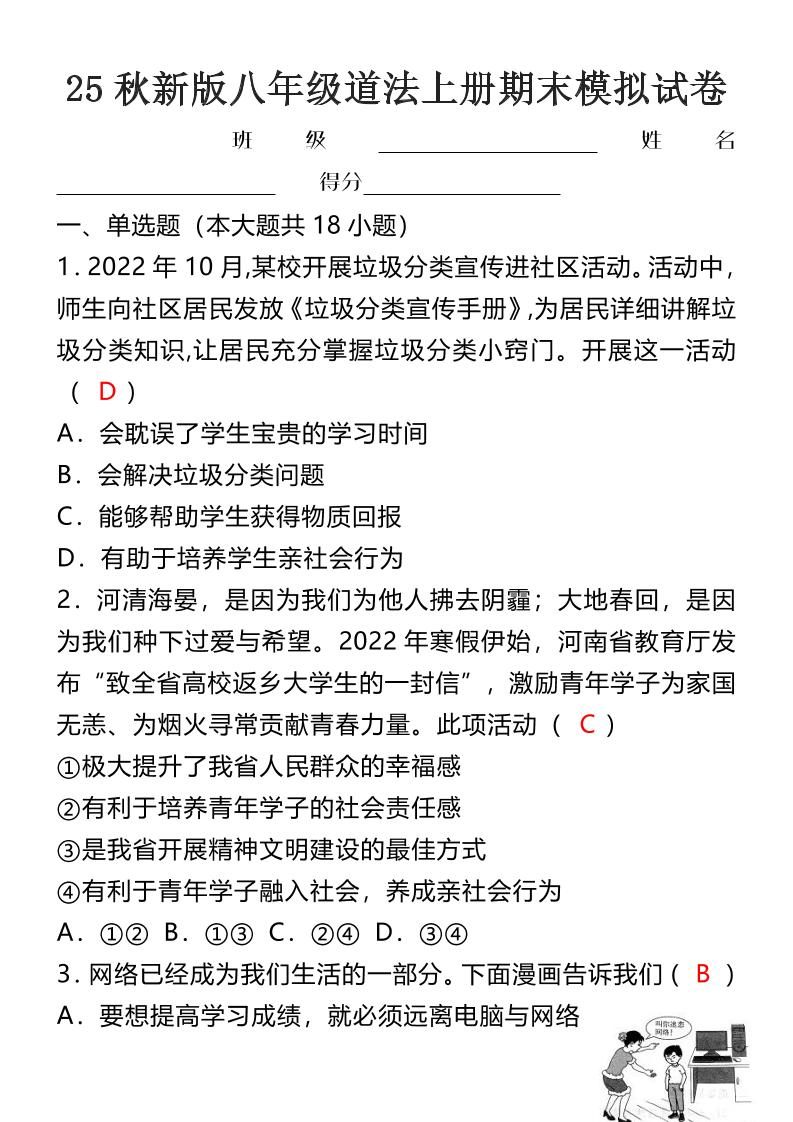 当前位置:首页学科年级八年级【2025秋新版】八年级道法上册期末模拟试卷