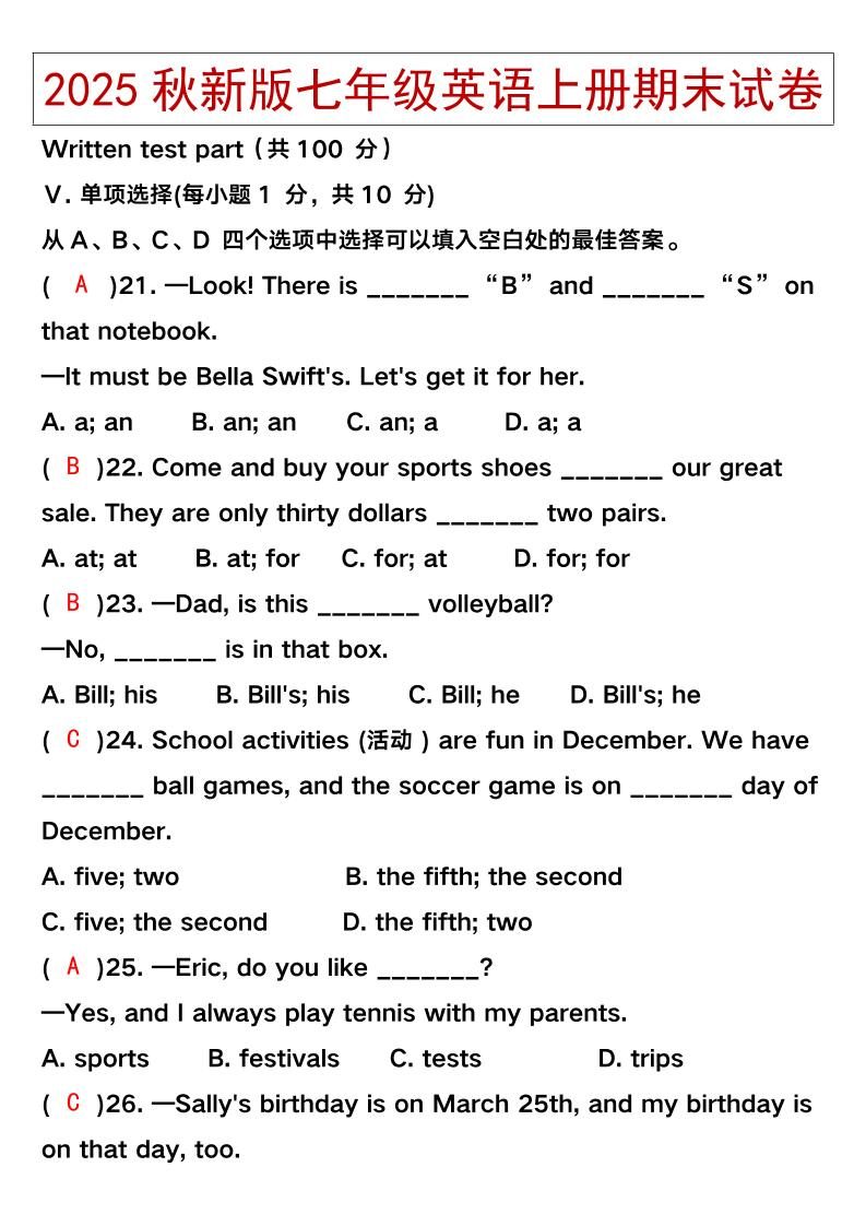 当前位置:首页学科年级七年级【2025秋新版】七年级英语上册期末试卷