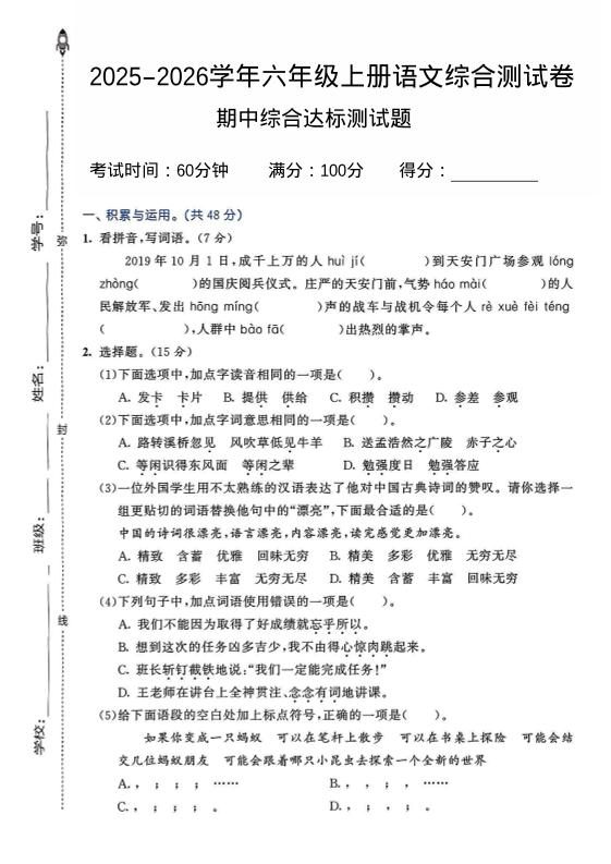 当前位置:首页学科年级六年级2025-2026学年六年级上册语文期中试卷2