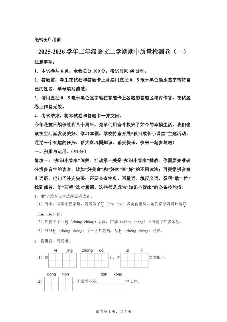 当前位置:首页学科年级二年级(新教材期中素养卷)25-26二上语文期中素养测评·基础卷01(含答案14页)