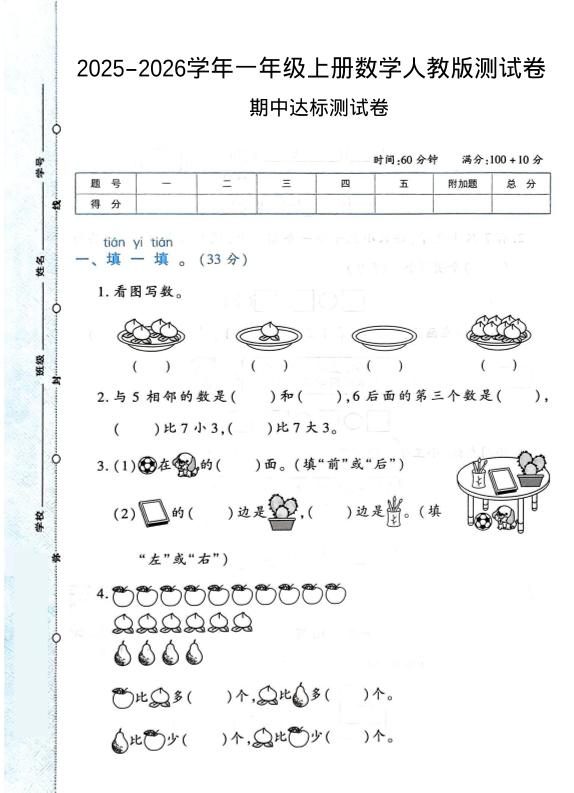 2025-2026学年人教版一上数学期中达标测试卷1(6页)