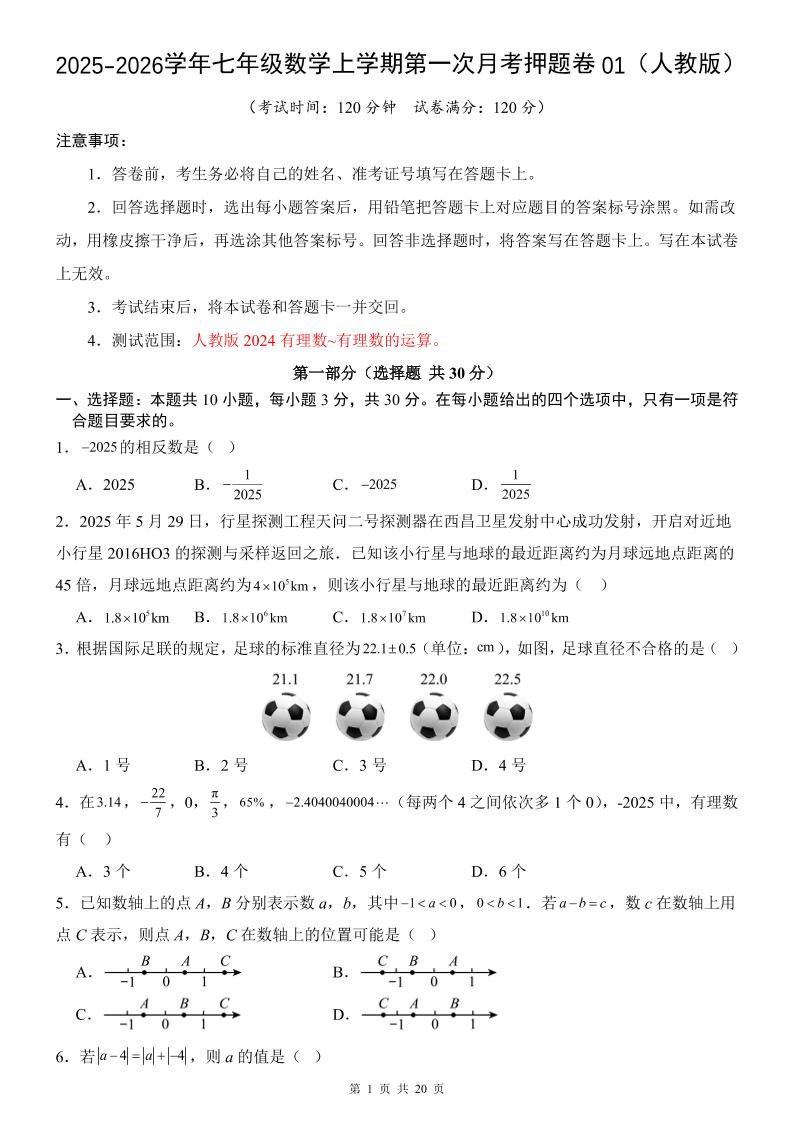 当前位置:首页学科年级七年级七年级上数学第1次月考卷01(人教版)