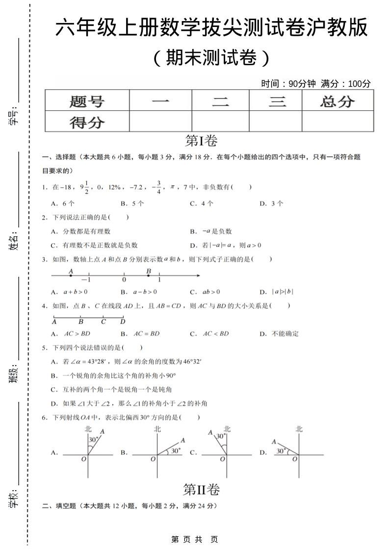 当前位置:首页学科年级六年级六年级上数学期末测试卷8《沪教版》