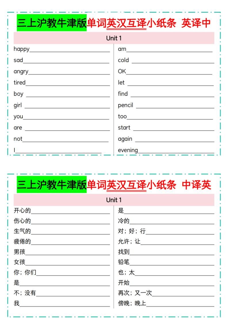 三年级上英语单词英汉互译小纸条《沪教牛津版》