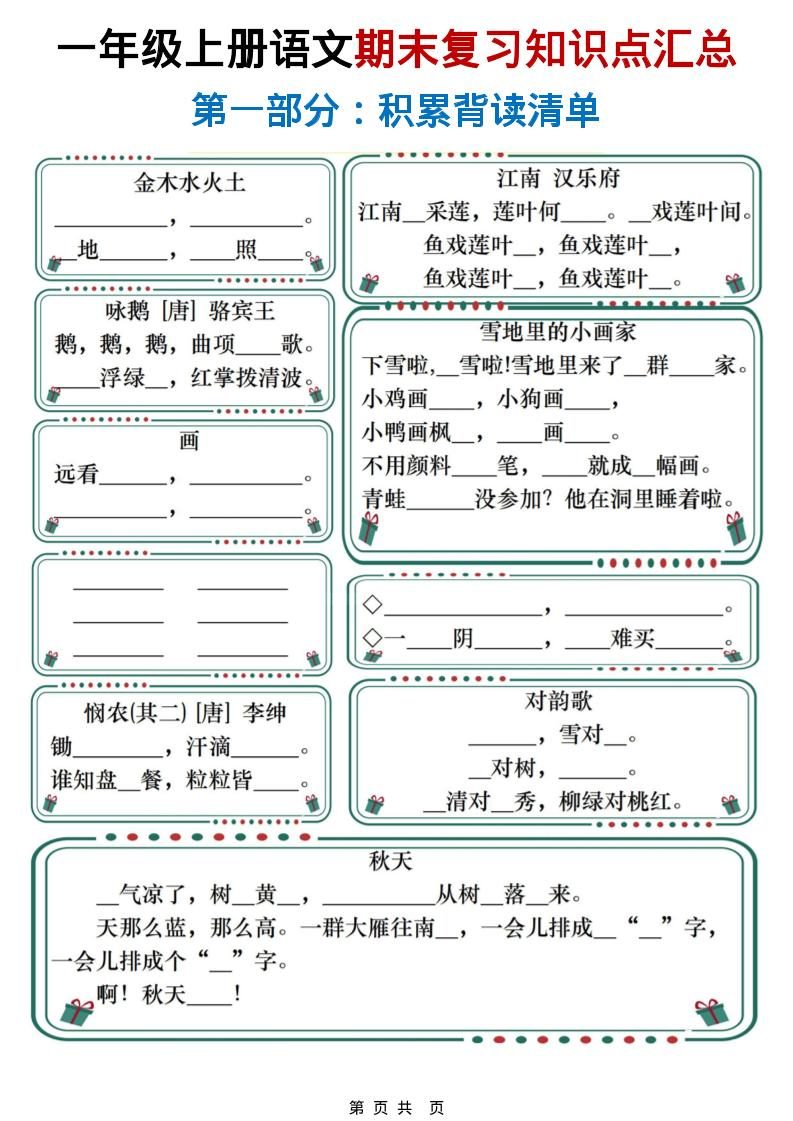 一年级上语文期末复习知识点总结练习