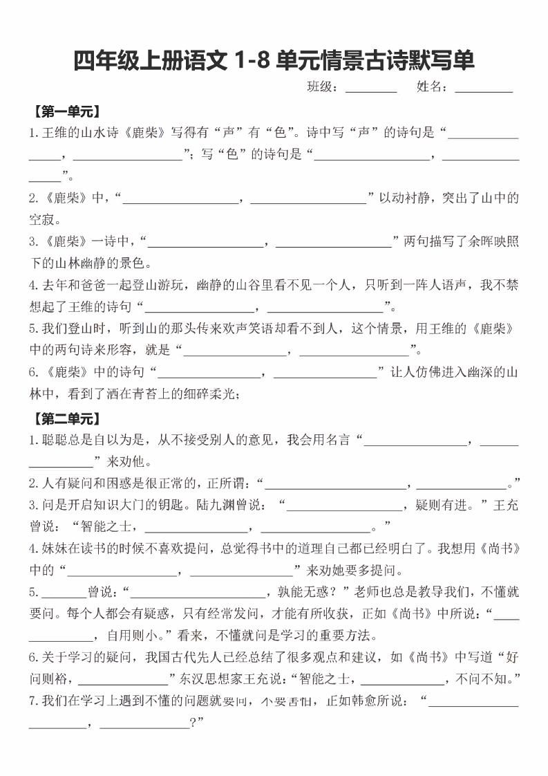 当前位置:首页学科年级四年级四年级上语文期末1-8单元情景古诗默写单含答案