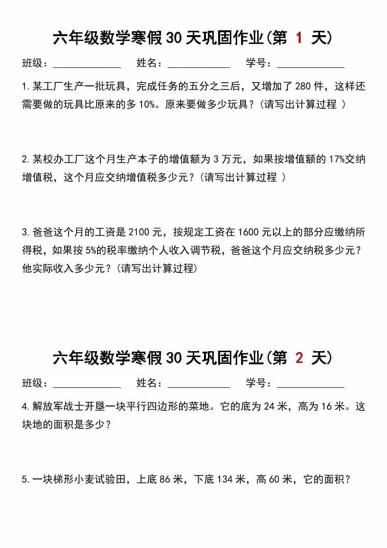 当前位置:首页学科年级六年级六年级上数学寒假作业每日一练30天