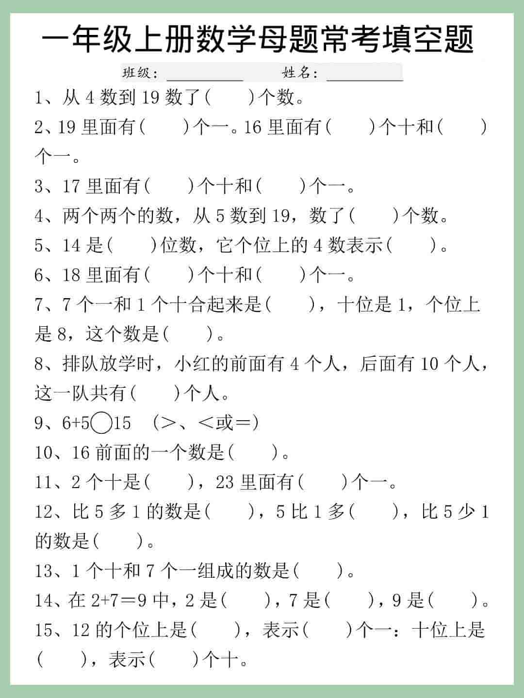 一年级上数学母题常考填空题