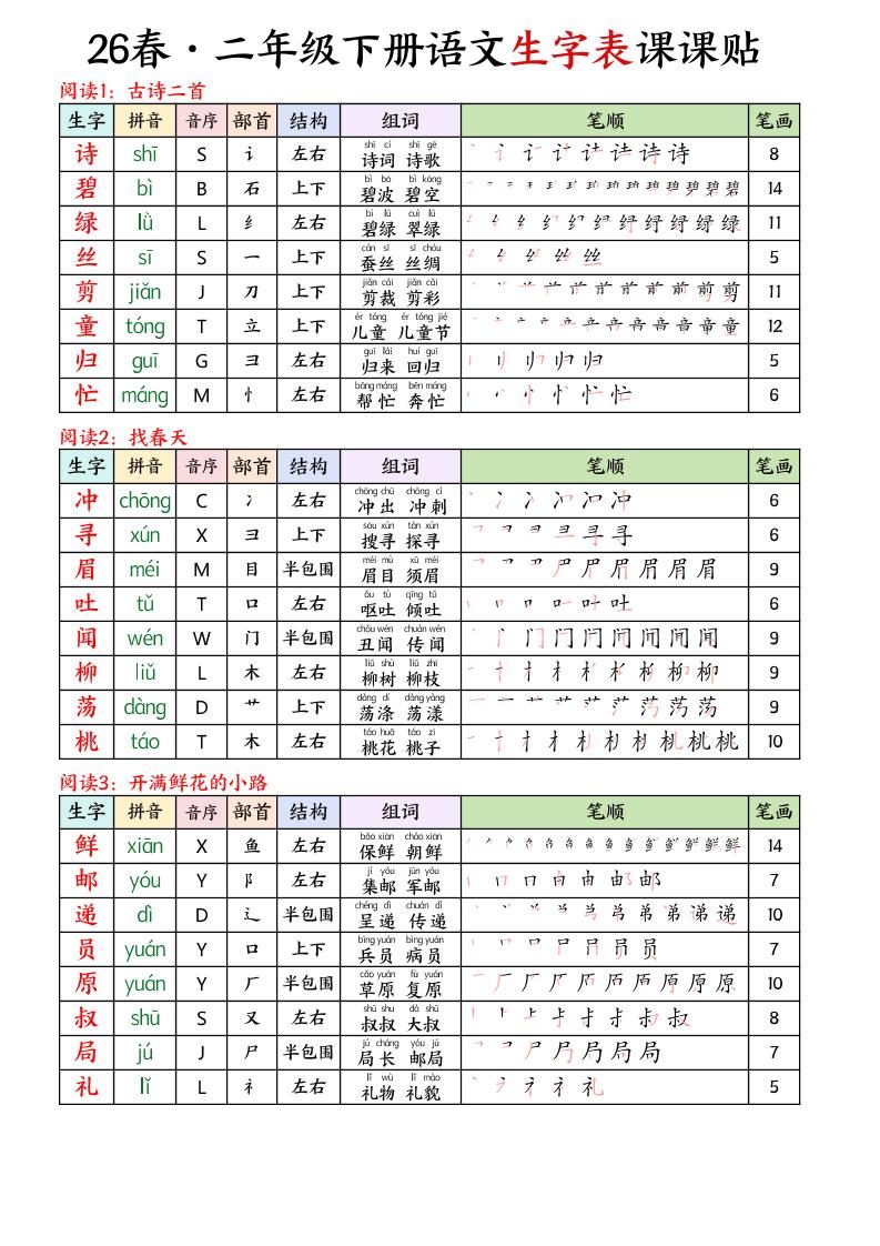26春二下语文写字表课课贴11页