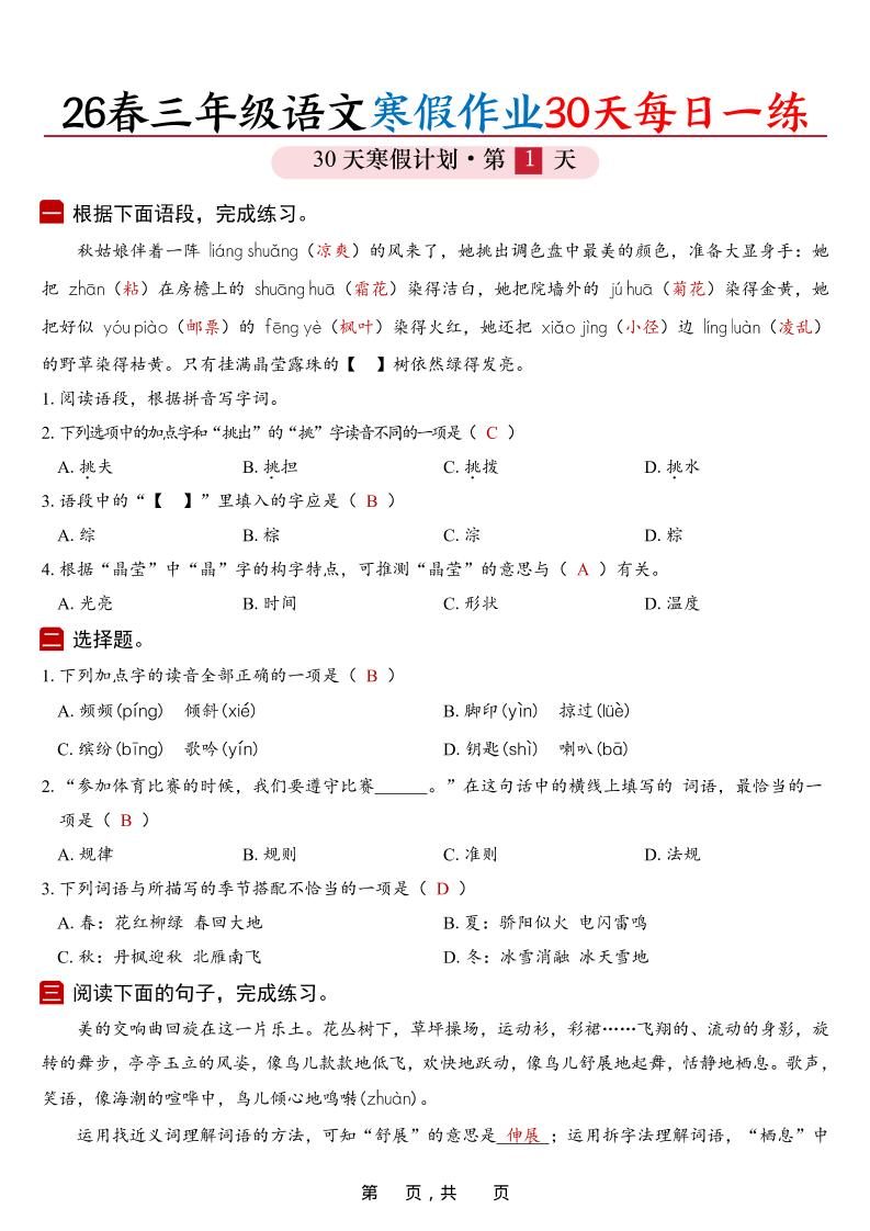 当前位置:首页学科年级三年级26春三年级上语文寒假作业30天每日一练(答案42页)