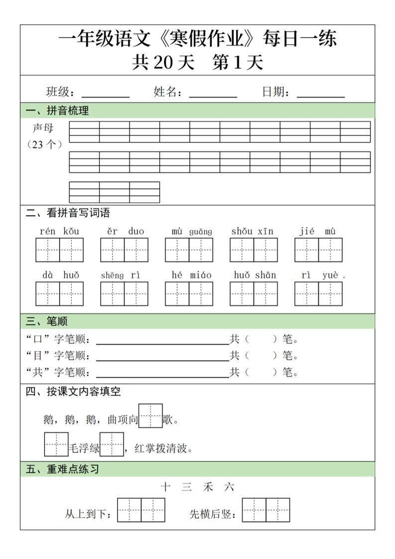 一年级上语文寒假作业每日一练(共20天)