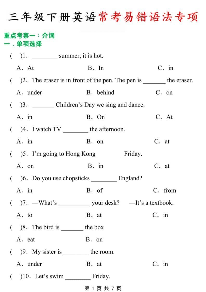 当前位置:首页学科年级三年级三年级下英语常考易错题