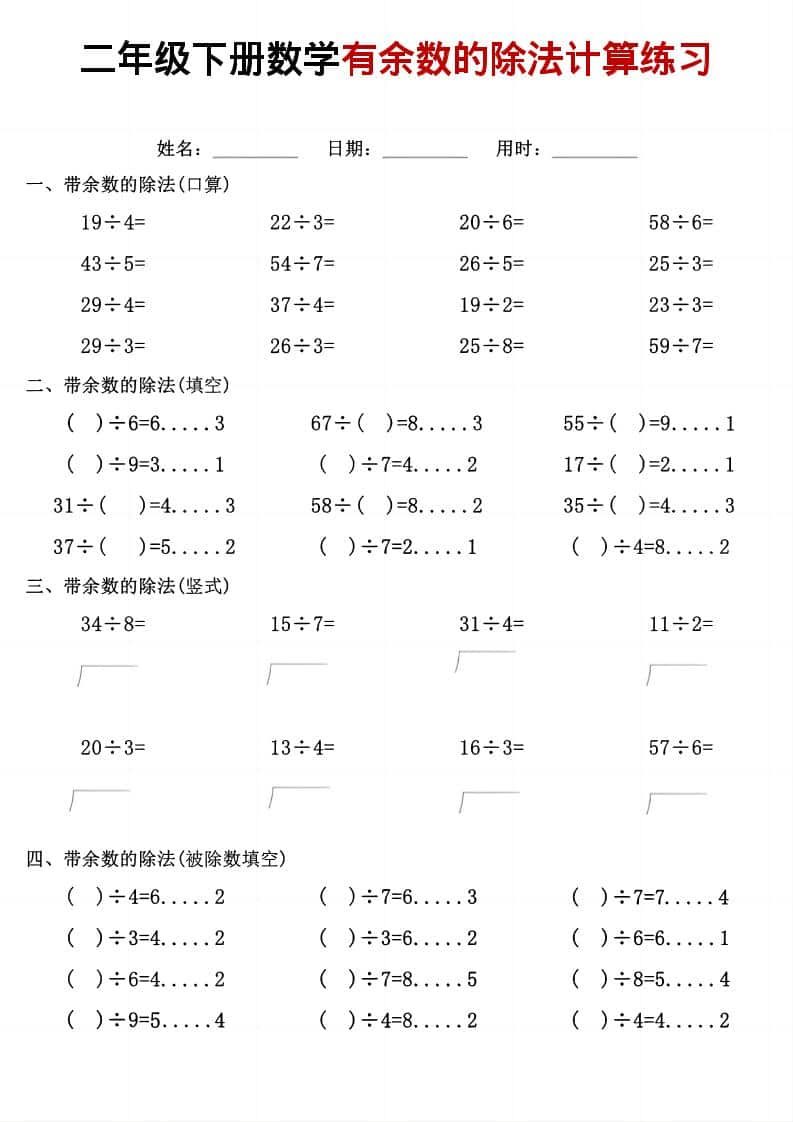 当前位置:首页学科年级二年级二年级下数学《有余数的除法》计算练习