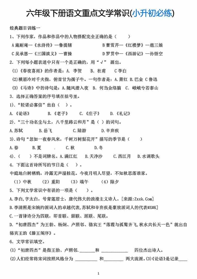 六年级下语文重点文学常识专项练习