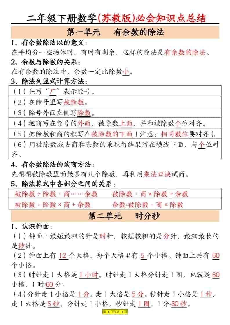 二年级下数学必会知识汇总《苏教版》
