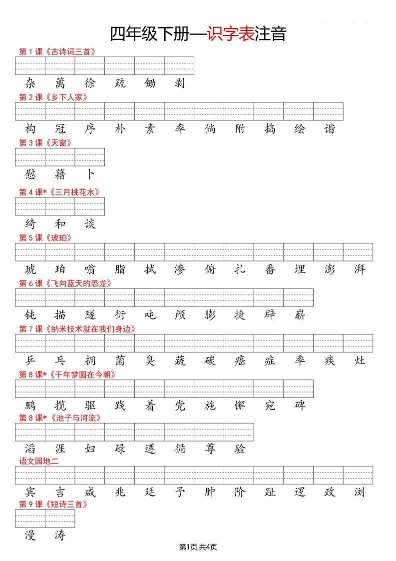 当前位置:首页学科年级四年级四年级下册语文看生字写拼音–识字表