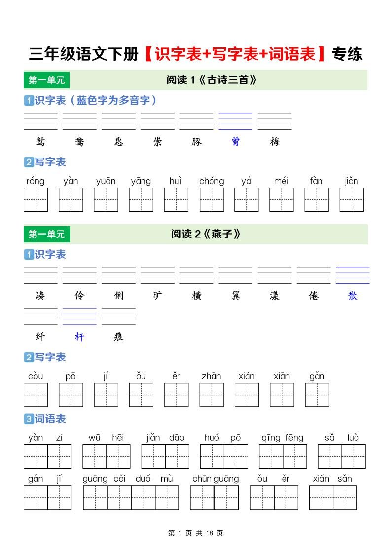 三年级下语文【识字表+写字表+词语表】专项练