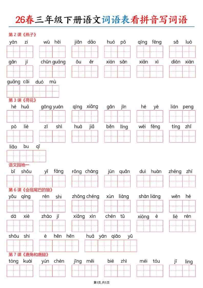 三年级下语文26春词语表看拼音写词语