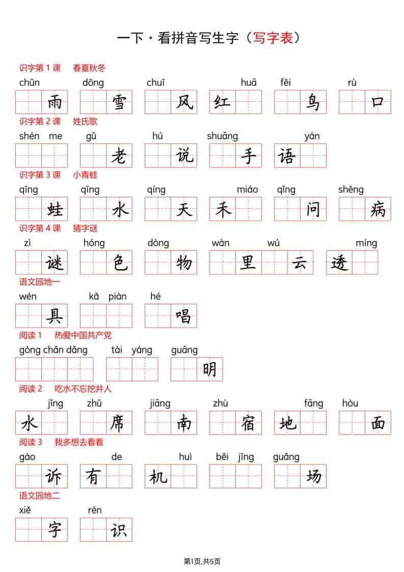 一年级下语文看拼音写生字(生字表)