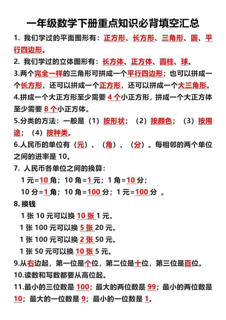 当前位置:首页学科年级一年级一年级下数学重点必背填空汇总