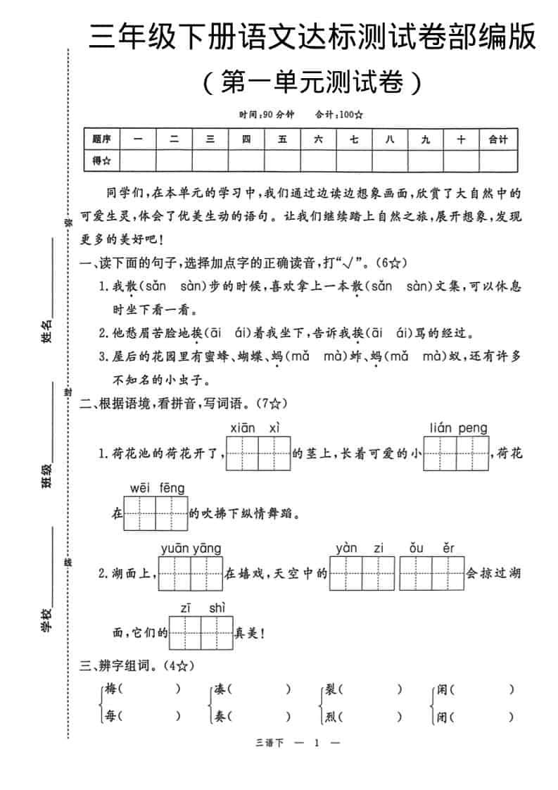 三年级下语文第一单元达标测试卷