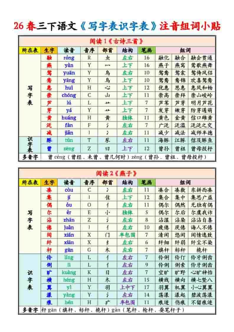 三年级下语文写字表识字表注音组词课课贴