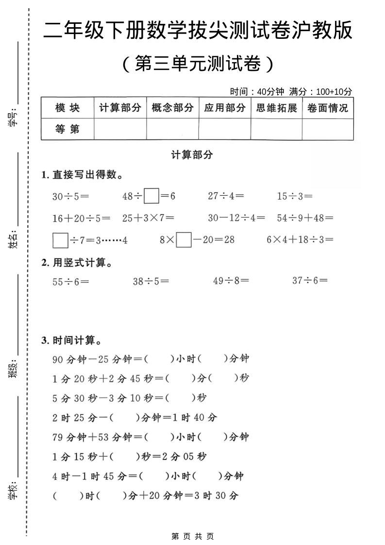 当前位置:首页学科年级二年级二年级下数学第三单元拔尖测试卷《沪教版》