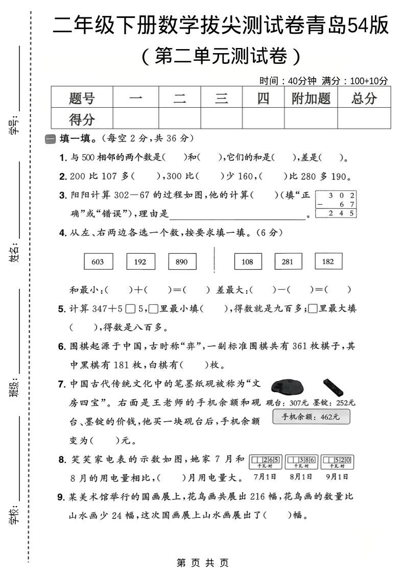 当前位置:首页学科年级二年级二年级下数学第二单元拔尖测试卷《青岛五四版》