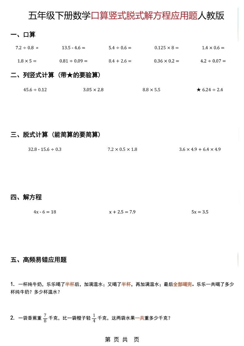五年级下数学口算脱式计算解方程应用题《人教版》
