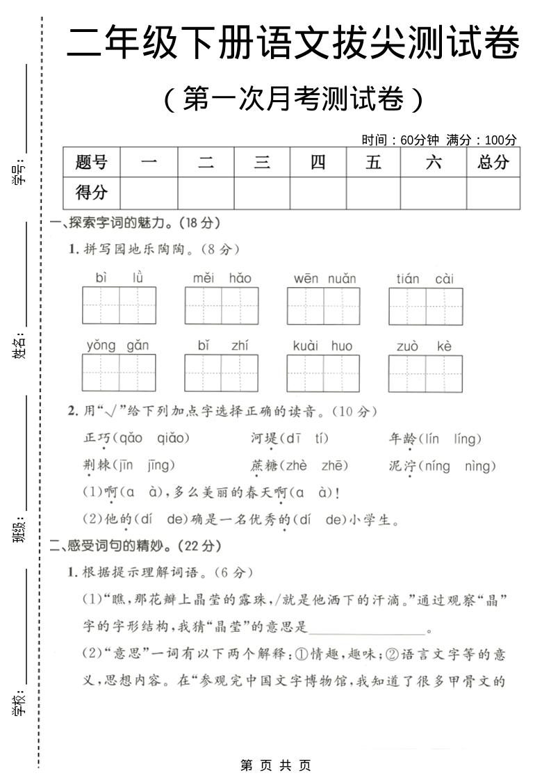 当前位置:首页学科年级二年级二年级下语文第一次月考拔尖测试卷1